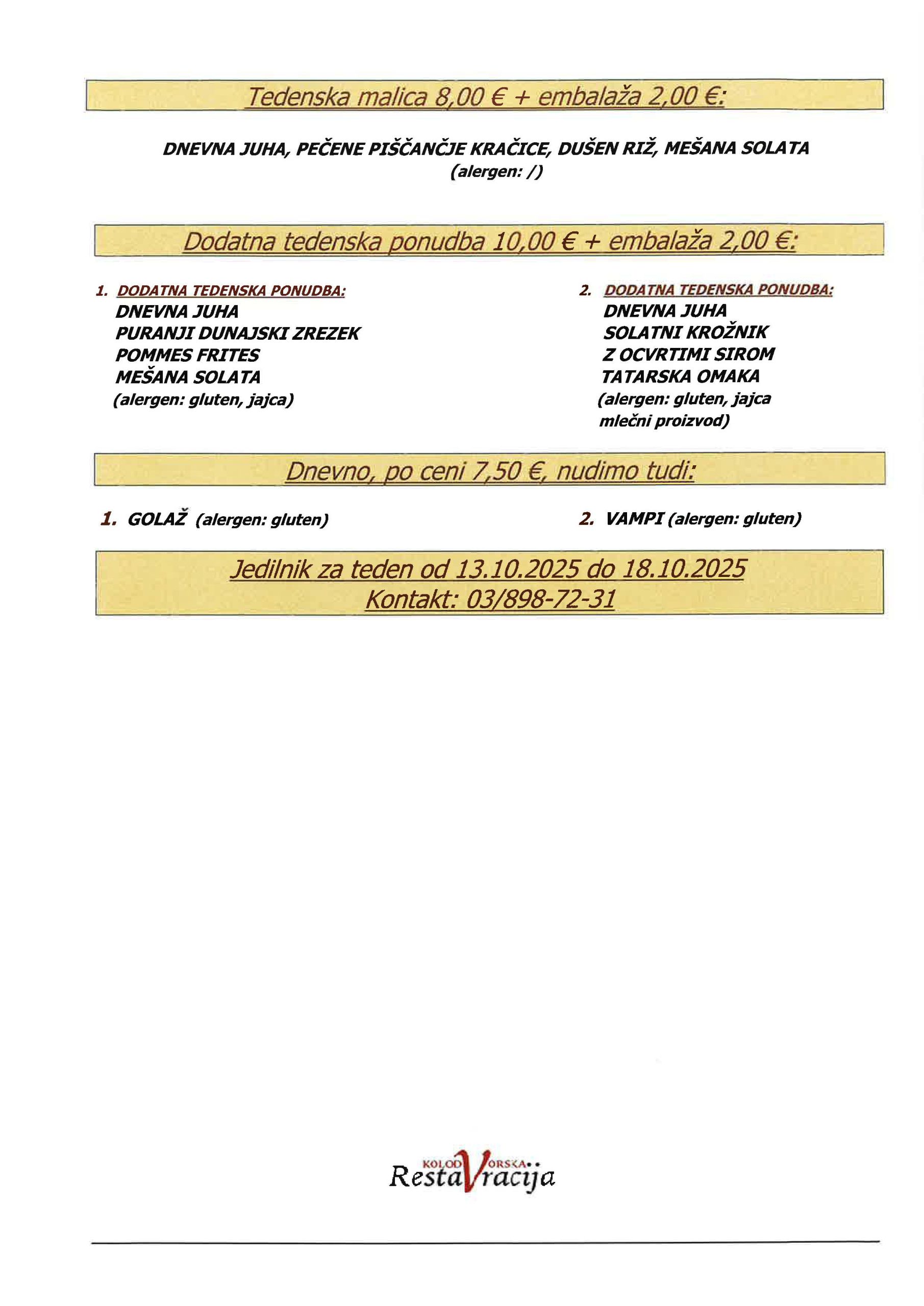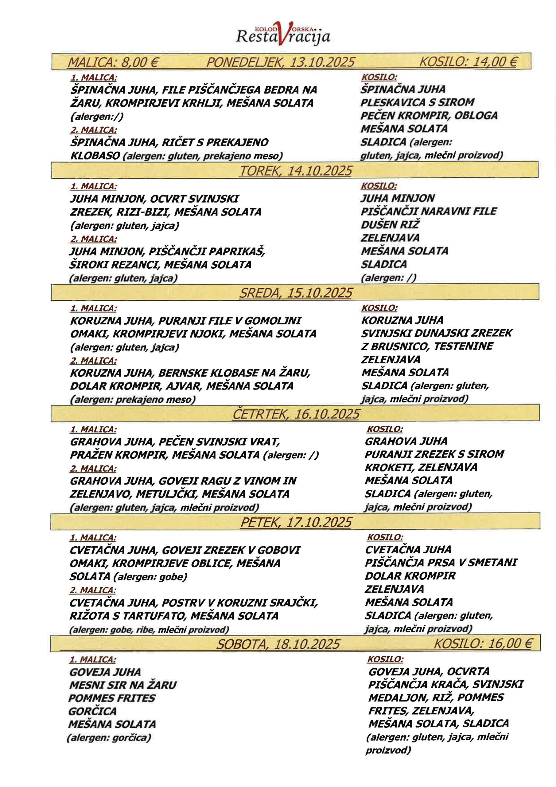 GOVEJA JUHA, SVINSKA PEČENKA, PIŠČANČJI DUNAJSKI ZREZEK, RIŽ, KROMPIR, ZELENJAVA, MEŠANA SOLATA, SLADICA (alergen: gluten, jajca, mlečni proizvod)