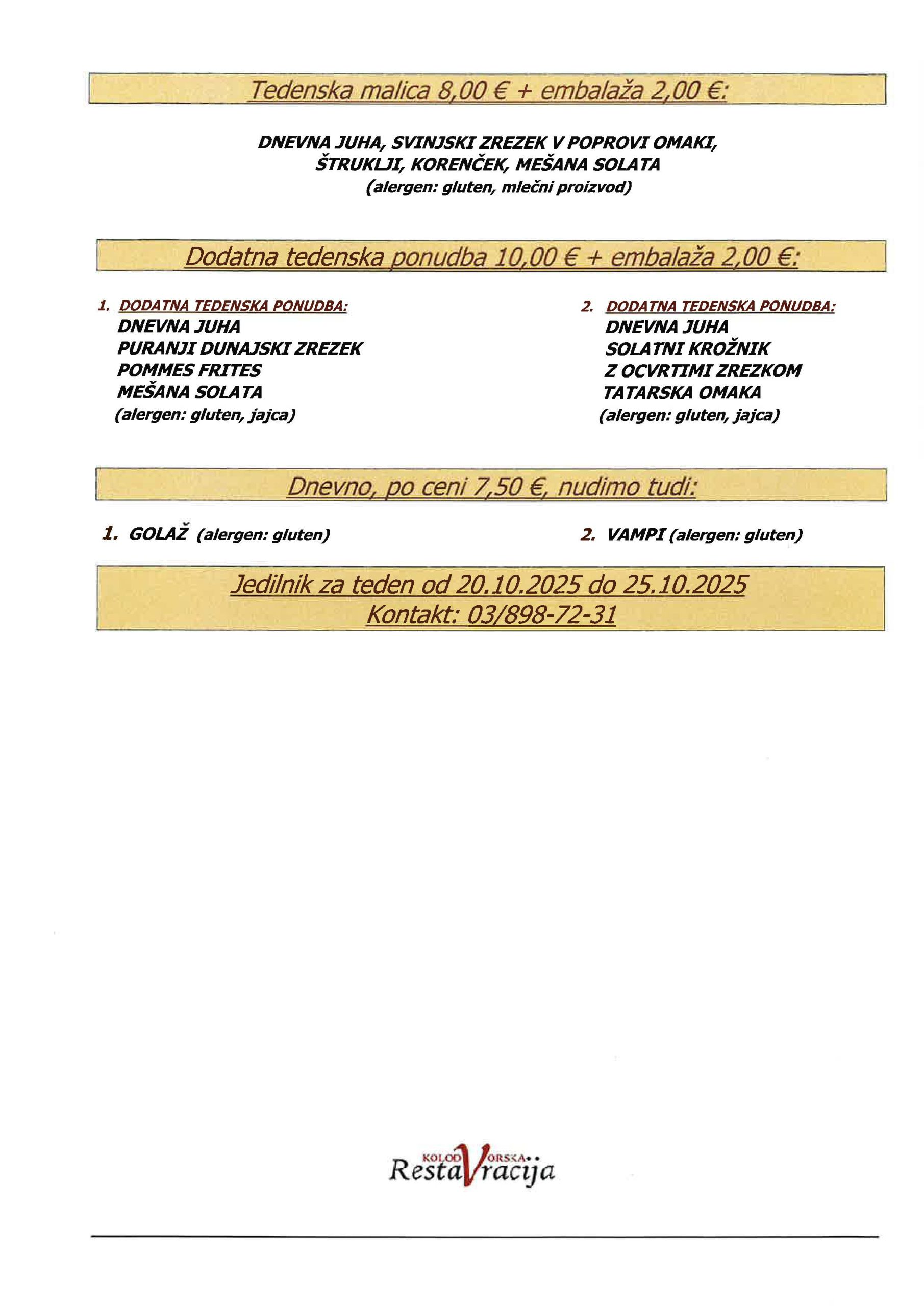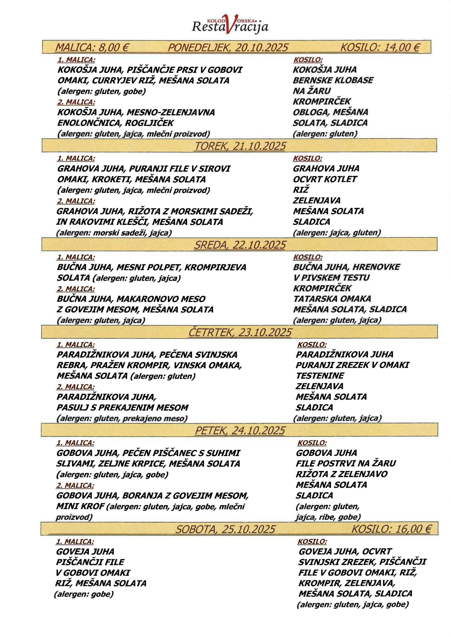 Cena za malico: 8 € / Cena za kosilo: 14,00€ (sobota 16 €).