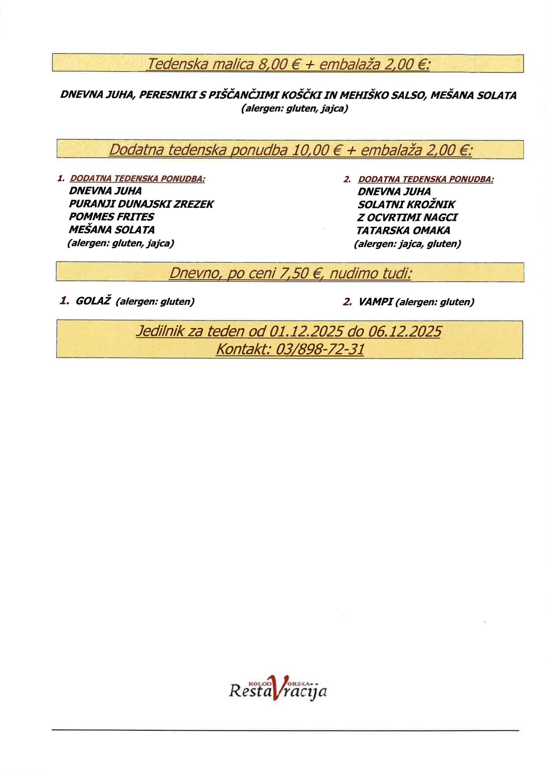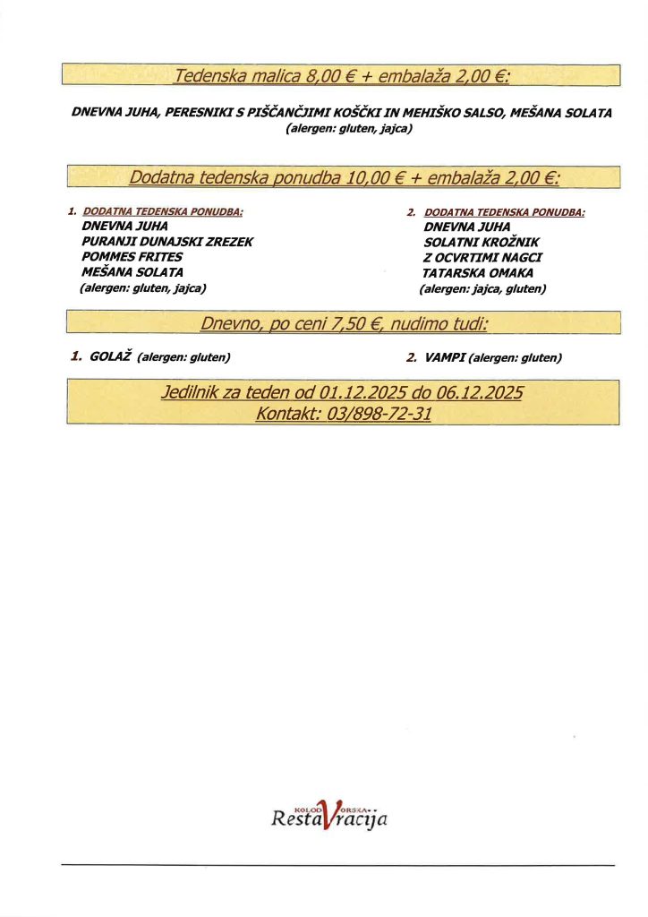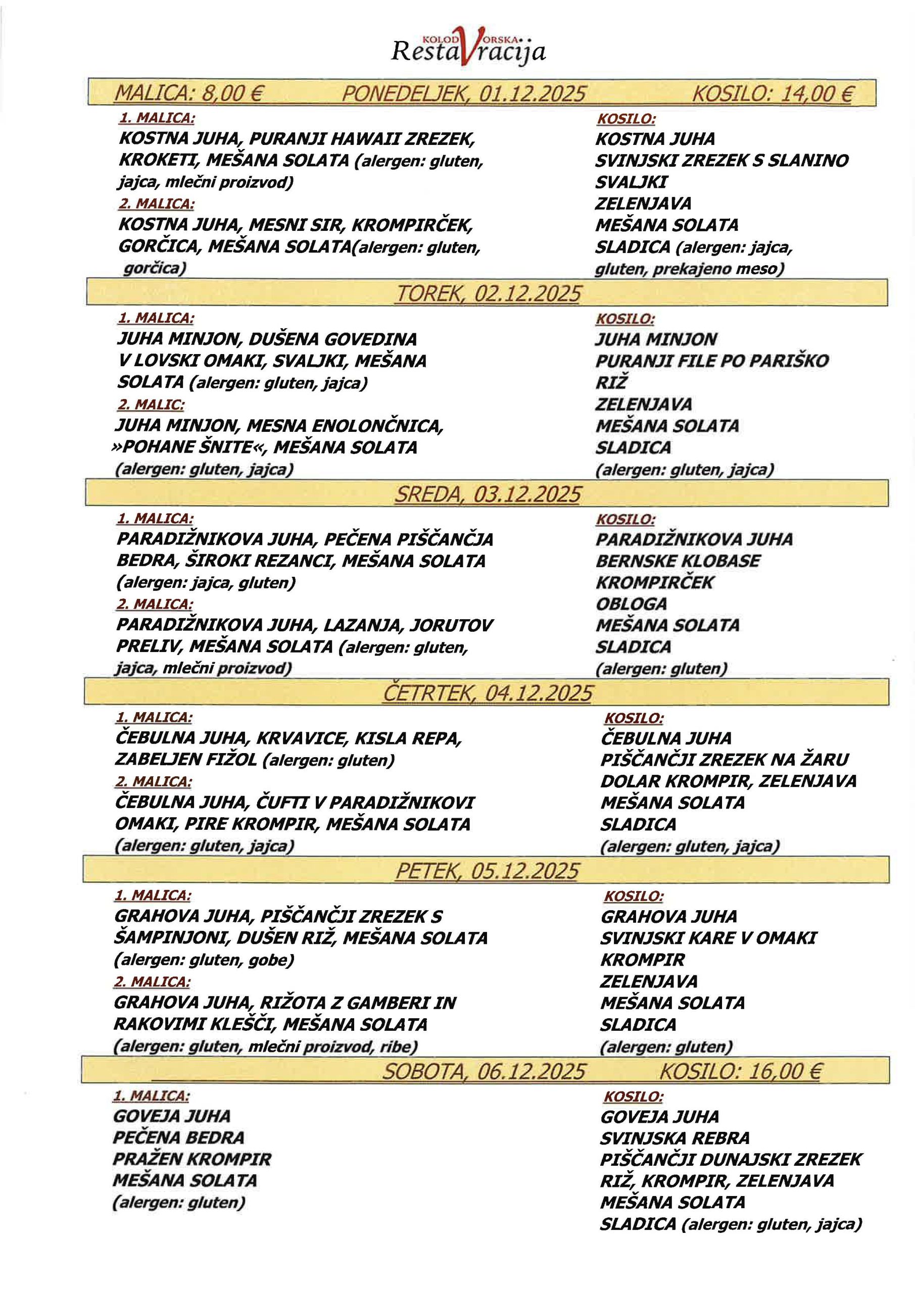 GOVEJA JUHA, SVINJSKA PEČENKA, PIŠČANČJI DUNAJSKI ZREZEK, RIŽ, KROMPIR, ZELENJAVA, MEŠANA SOLATA, SLADICA (alergen: gluten, jajca)