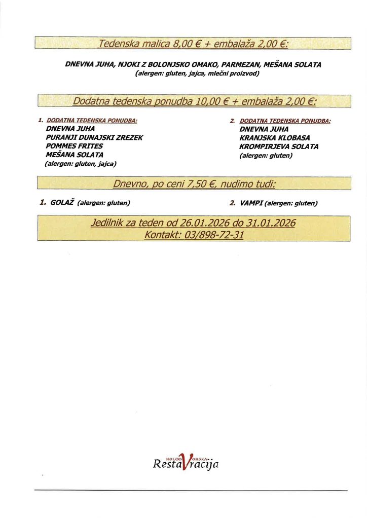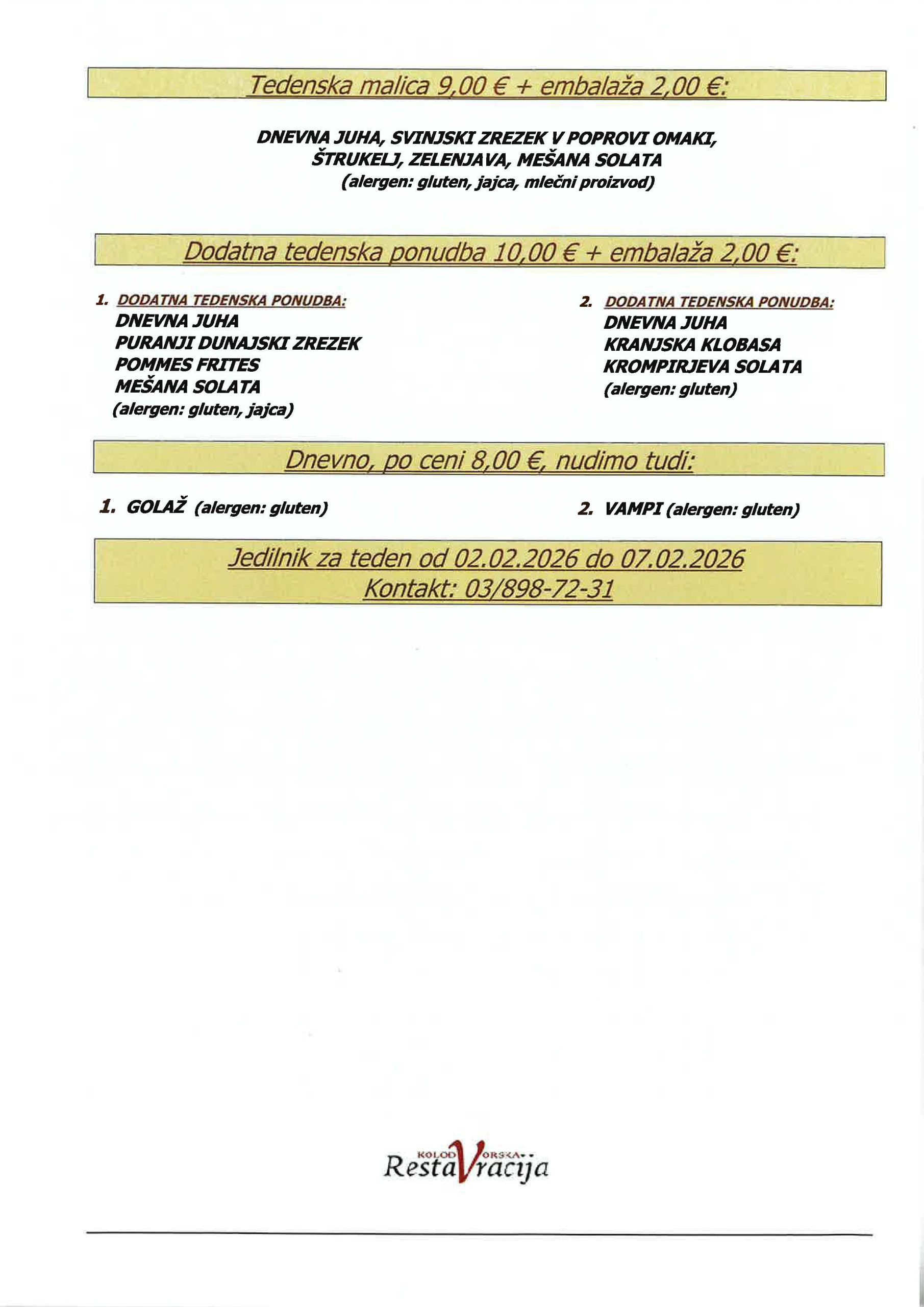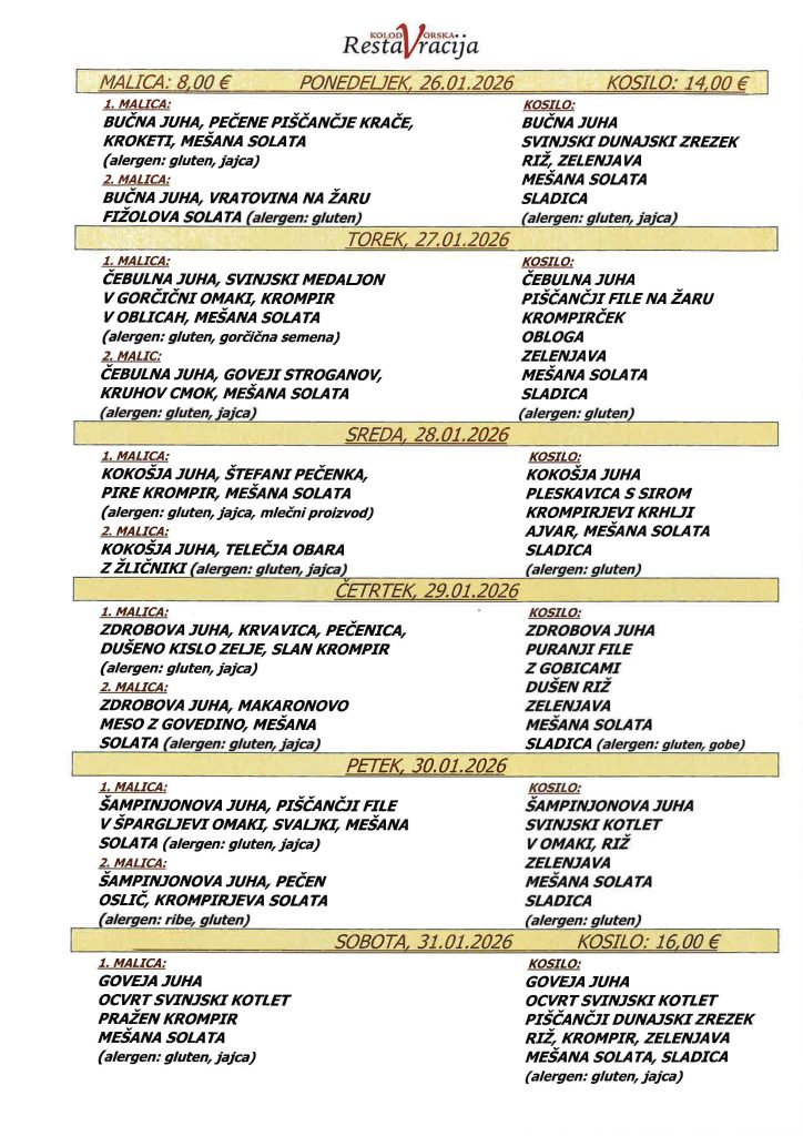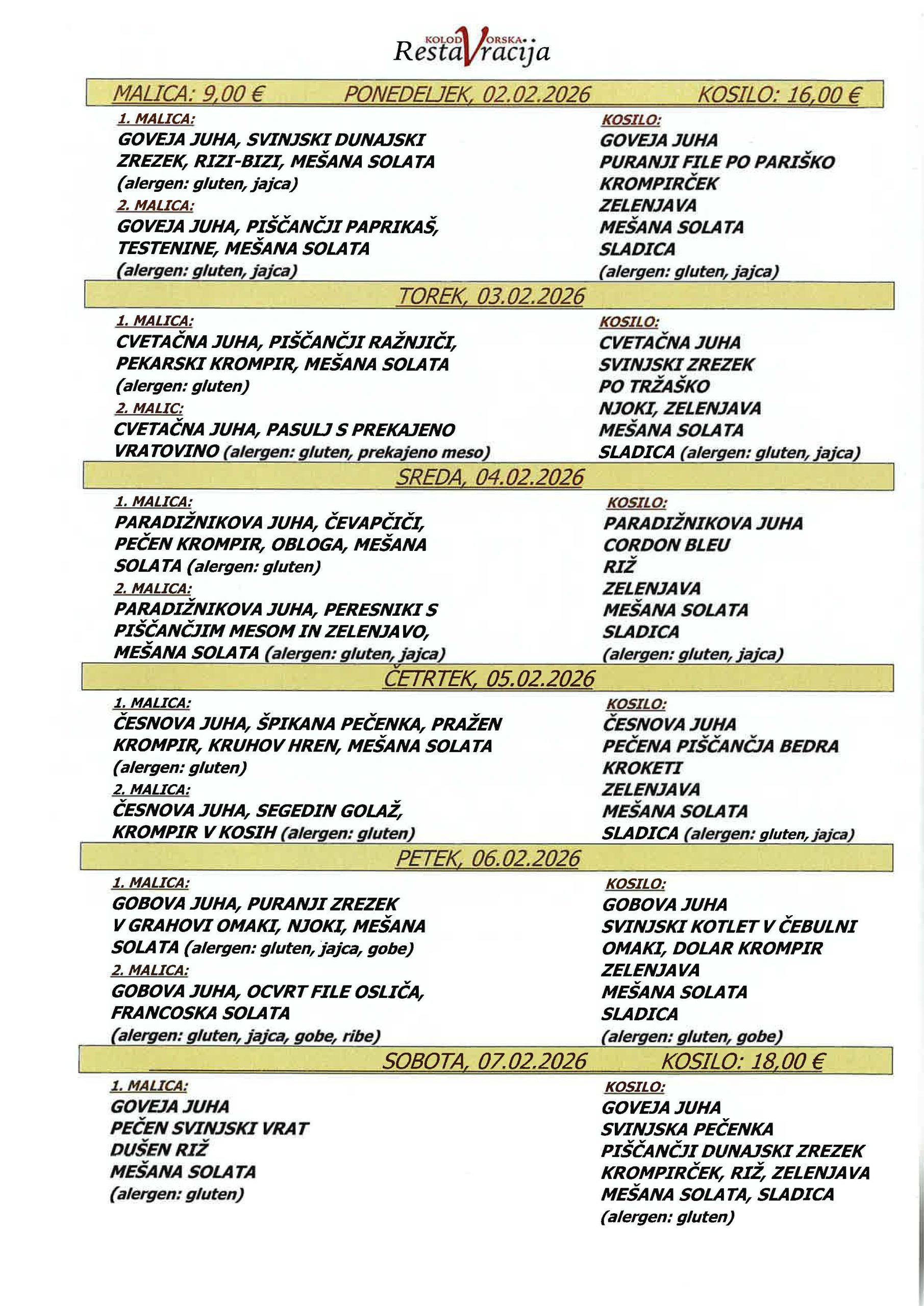 GOVEJA JUHA, OCVRT SVINJSKI KOTLET, PIŠČANČJI DUNAJSKI ZREZEK, RIŽ, KROMPIR, ZELENJAVA, MEŠANA SOLATA, SLADICA (alergen: gluten, jajca)