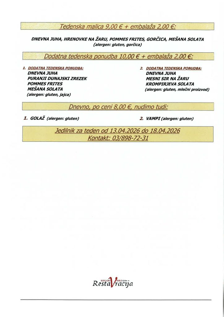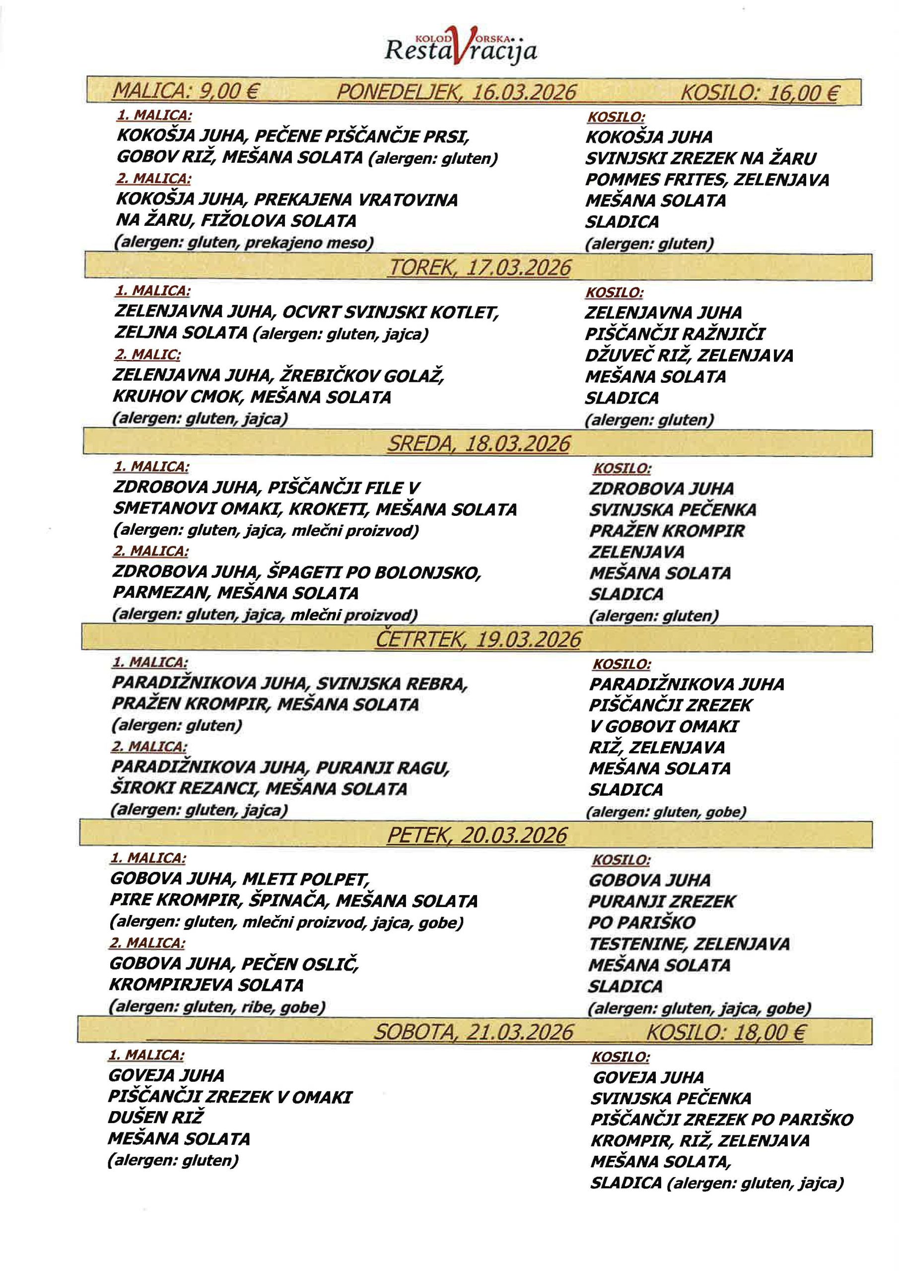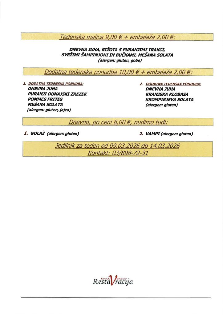 Cena za malico: 9 € / Cena za kosilo: 16,00€ (sobota 18 €).