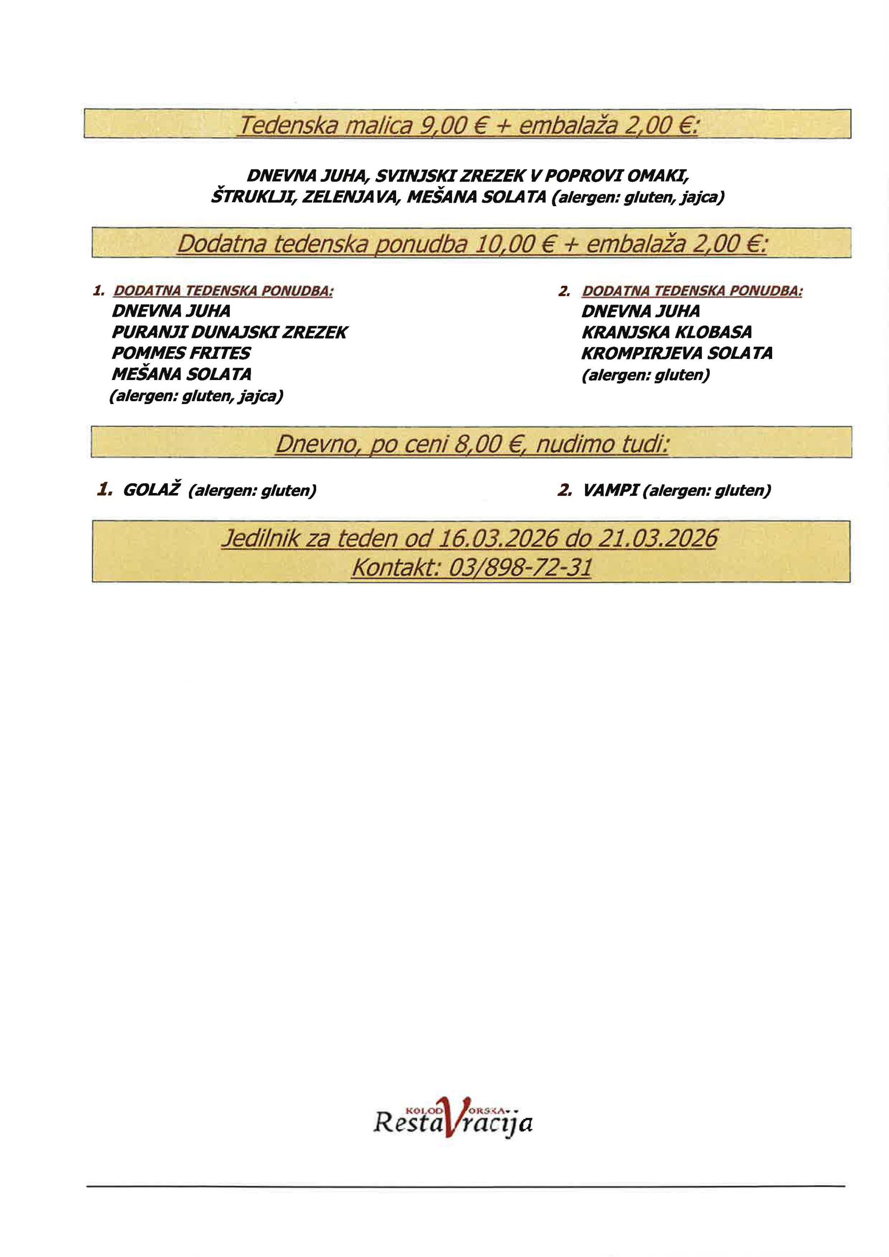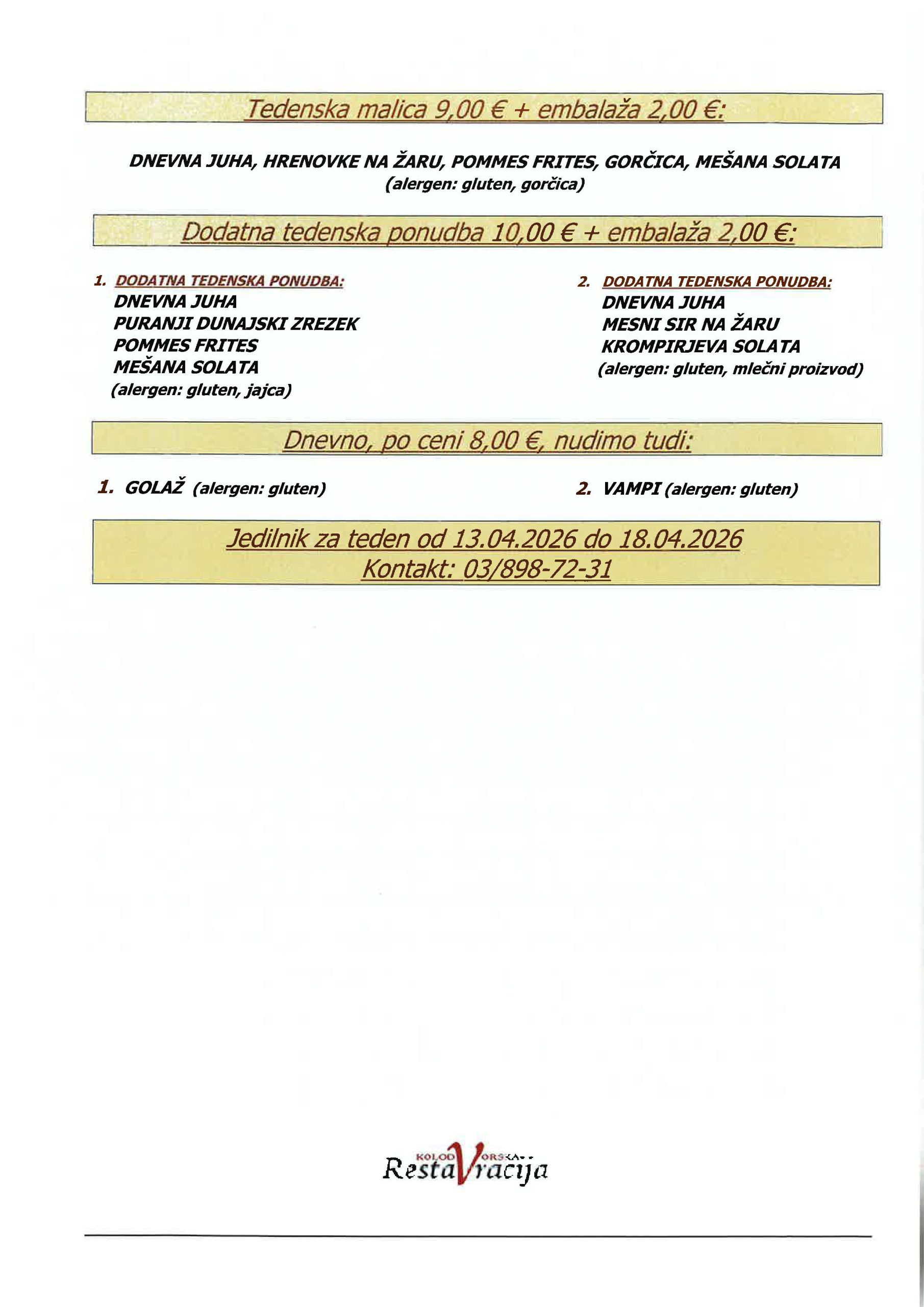 DNEVNO NUDIMO TUDI GOLAŽ (alergen: gluten) 8,00 € IN VAMPE (alergen: gluten) 8,00 €