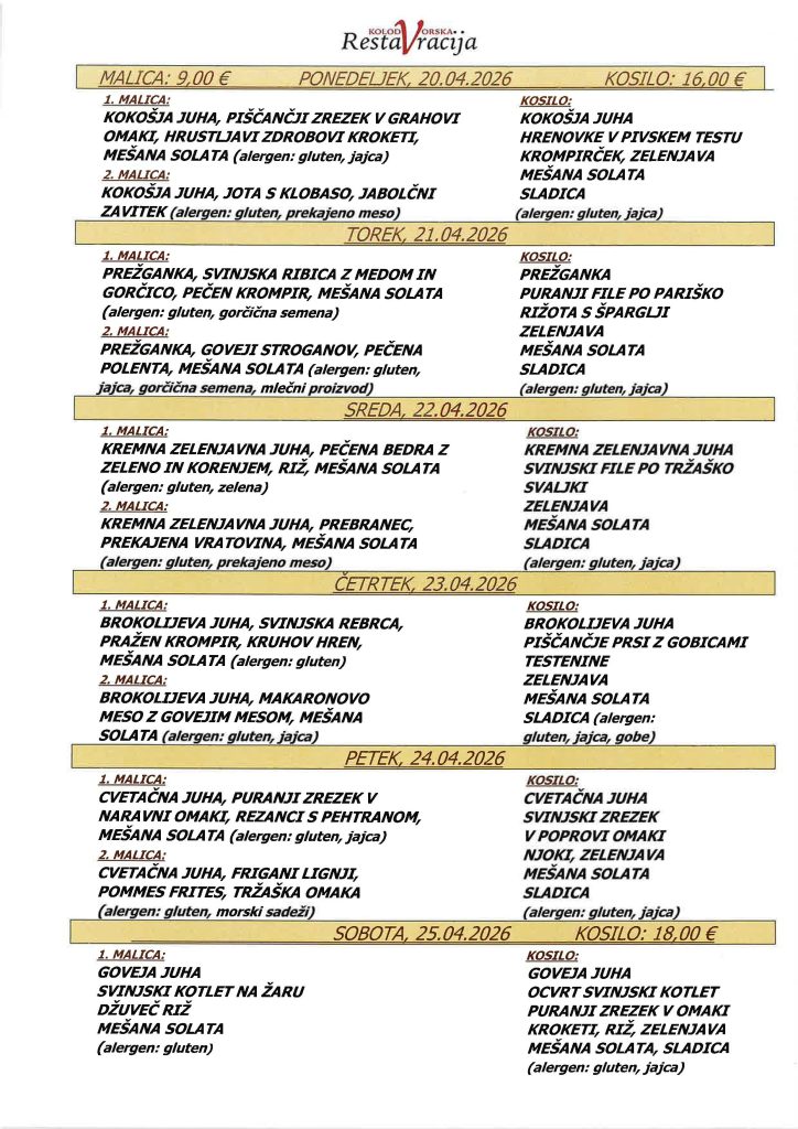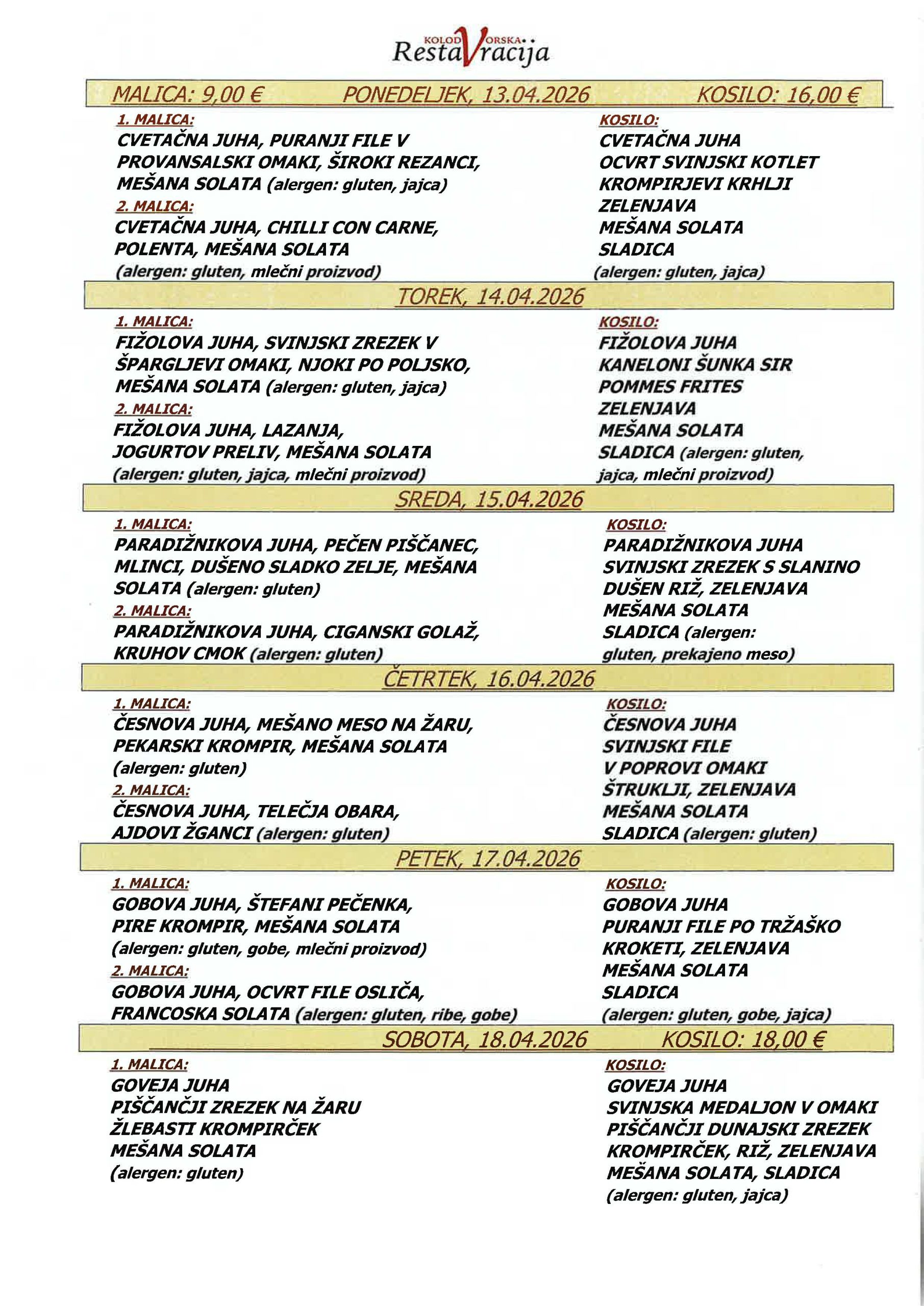 GOVEJA JUHA, SVINJSKA MEDALJON V OMAKI, PIŠČANČJI DUNAJSKI ZREZEK, KROMPIRČEK, RIŽ, ZELENJAVA, MEŠANA SOLATA, SLADICA (alergen: gluten, jajca)